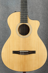The 112ce-N is Taylor's first 100 Series nylon-string cutaway Grand Concert, blending the warm, snappy sound of nylon strings with a comfortable, compact body shape. It offers an outstanding value for players of all skill levels. Featuring a solid, torrefied spruce top paired with layered sapele back and sides, this acoustic electric offers a clear, balanced voice ideal for fingerstyle players and light strumming. Its 12-fret neck and 1-7/8-inch nut width (narrower than a traditional classical guitar neck) make it easy to play, especially for those transitioning from steel-string guitars. A specialized voicing architecture is designed to enhance the natural warmth and clarity of the nylon strings, providing a well-balanced and responsive tone. Equipped with onboard ES-N electronics, the 112ce-N offers reliable amplified sound for studio settings and stage performances. Its matte-finished body features black binding and a 3-ring rosette. The ebony fretboard is inlaid with 4mm Dots in Italian acrylic and the slotted peghead is outfitted with classical nickel tuners. This model comes in a structured gig bag, offering lightweight protection for players on the move. It's a great option for players who crave the comfort of a small-bodied guitar, signature Taylor playability and rich nylon flavours at an accessible price point.