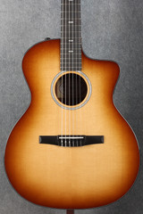 The Sunset Boulevard 214ce-N Plus SEB bridges the gap between classical expression and modern steel-string feel. This cutaway Grand Auditorium offers a more playable nylon-string experience than traditional wide-necked classical guitars. A solid torrefied spruce top paired with layered Indian rosewood back and sides an articulate, snappy, neoclassical sound enriched by hints of played-in depth and sweetness. Offering exceptional comfort and playability, a slim Taylor neck with a 1-7/8" nut width makes the transition from steel to nylon strings smooth and approachable. Aesthetic details include a golden-brown Sunset Edge burst, full-body gloss finish, Italian acrylic diamond inlays, and a custom label inside. Equipped with classical nickel tuners with pearloid buttons and an ES-N pickup system, this model features two elements common to Taylor 200 Plus Series models-a gloss-finish body and a lightweight, durable Aero Case. Fans of classical guitars and players seeking to add fresh nylon-string flavours and textures to their tonal palette should take the Sunset Boulevard 214ce-N for a drive.